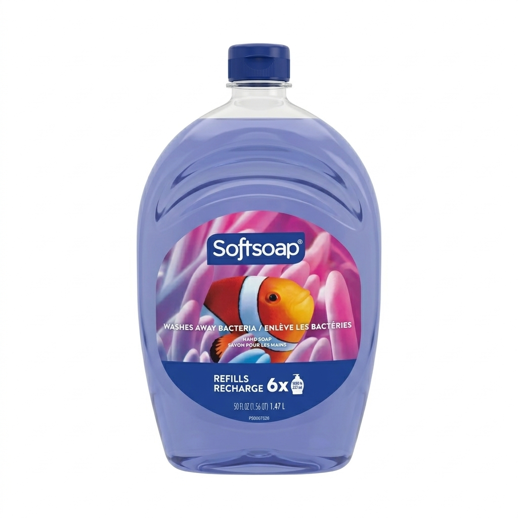 Transform the simple task of washing hands into an aquatic adventure with Softsoap Liquid Hand Soap, Aquarium Series. This 50 fl oz (1.47 L) refill bottle is a sustainable and cost-effective way to keep your household healthy and clean while cutting down on plastic waste. Featuring the beloved vibrant clownfish graphic, this refill brings a touch of color and fun to your bathroom or kitchen sink, making handwashing enjoyable for children and adults alike.