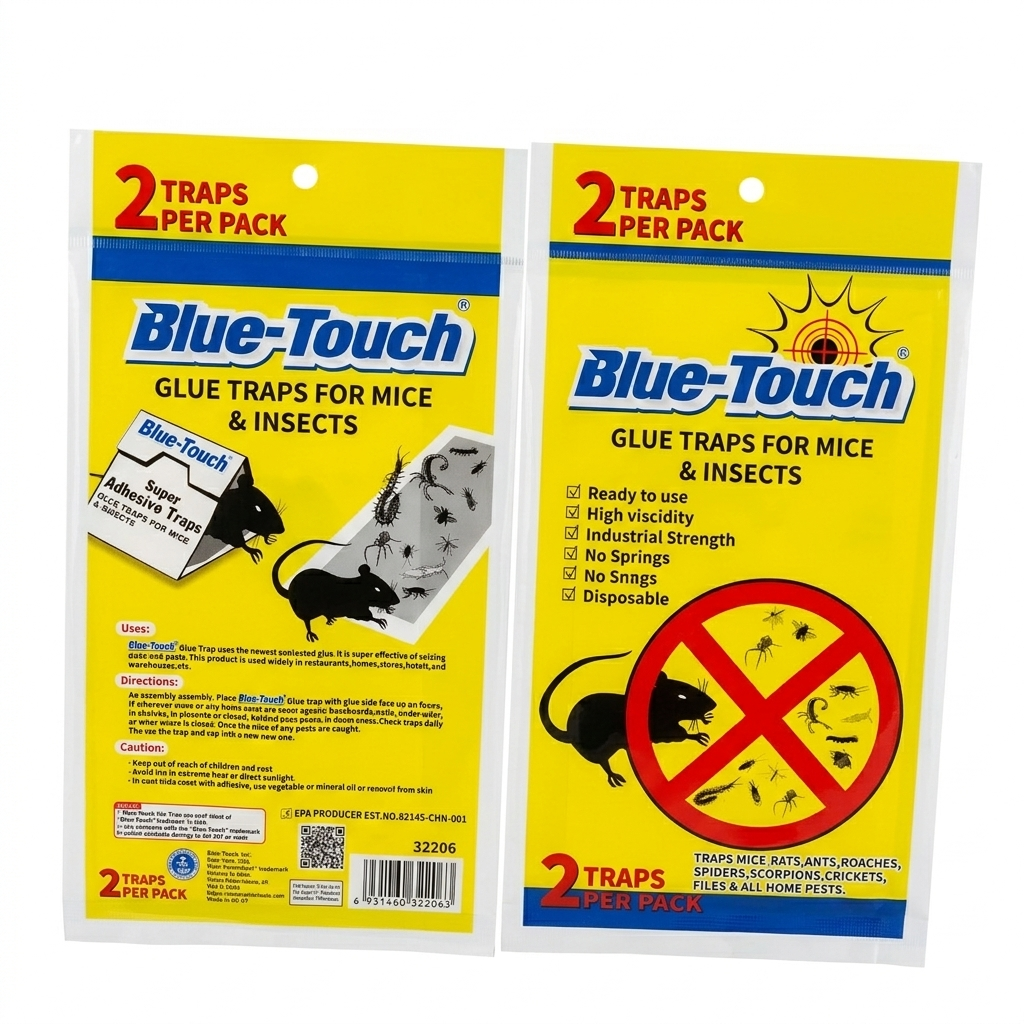 Keep your home or business pest-free with the high-performance power of Blue-Touch Glue Traps. This 2-count pack features industrial-strength, high-viscosity glue designed to capture and hold mice, rats, and a wide variety of crawling insects on contact. Whether you're dealing with a garage infestation or kitchen pests, these traps offer a reliable, ready-to-use solution without the need for springs or snapping mechanisms.