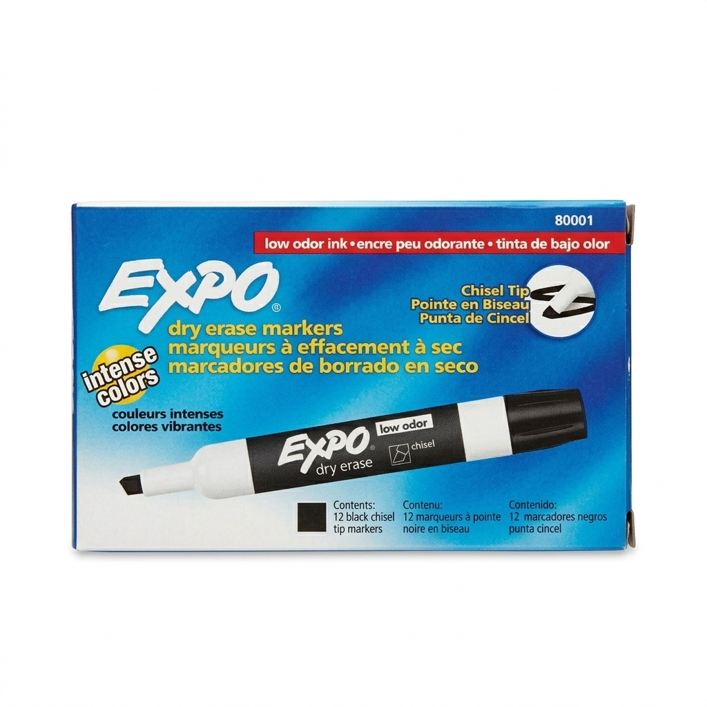 Keep your presentations and brainstorms sharp with the EXPO Low Odor Dry Erase Marker Set. This 12-count box of black markers is the industry standard for classrooms, offices, and home organization. Featuring a specially formulated low-odor ink, these markers provide a comfortable writing experience without the harsh chemical scent of traditional dry erase markers.